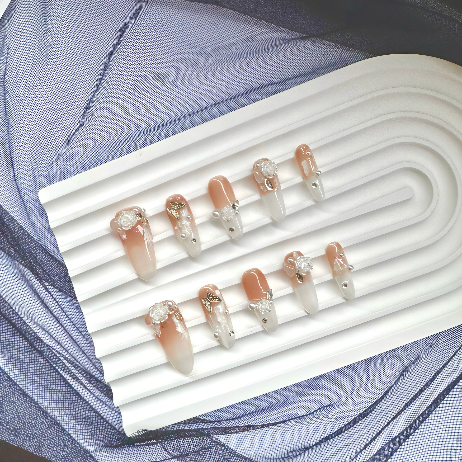 3D Rose Gradient Press On Nails | Beige Ombre with Metallic Butterfly Accents