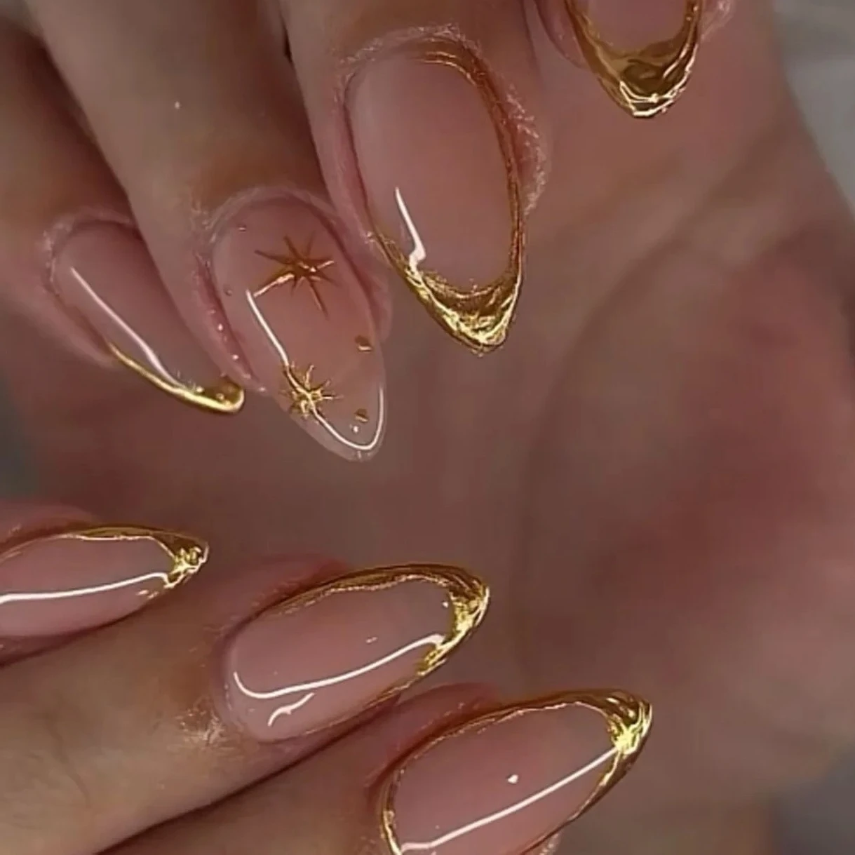 Hot Stamping Metal Gold Star Almond Fake Nails Art Thanksgiving Totem Moon Pearl Sun False Nails Charms Press on Nails Manicure