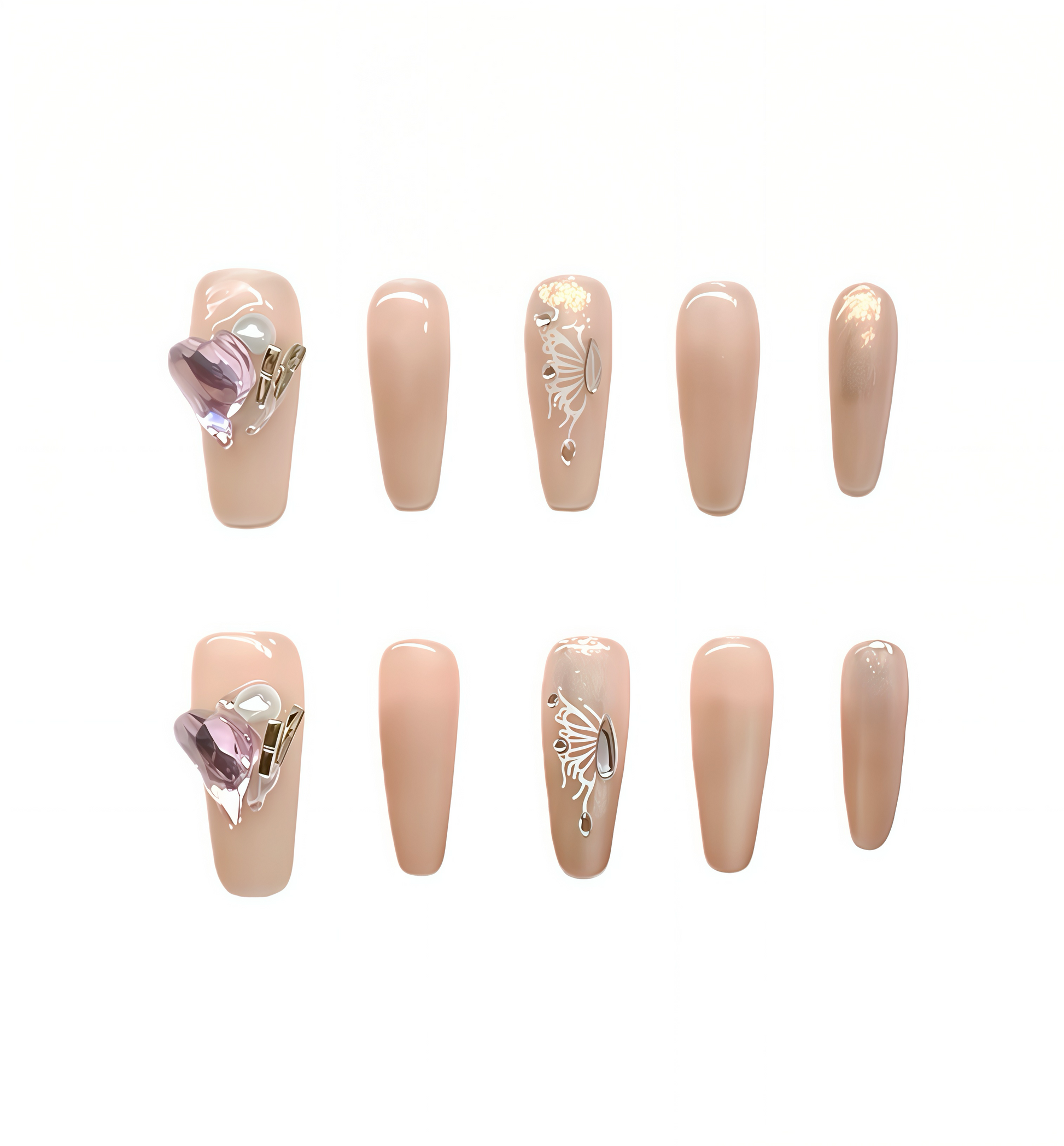 Elevate your manicure game instantly with these luxury - inspired press - on nails! Featuring a soft nude base, dazzling 3D crystal heart decor, delicate metallic details, and subtle shimmer accents, this set blends sophistication with whimsical charm.